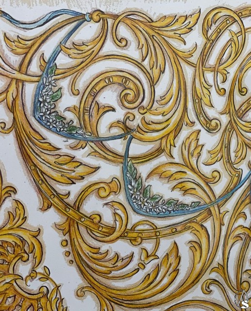 Unas cintas o “cortinillas”, de color celeste en alusión concepcionista, recorren las vistas frontales y el eje central trasero, recogiendo de tramo en tramo ramilletes de azahares. Otras flores como rosas, margaritas, azucenas y tulipanes se reparten por toda la ornamentación, las cuales llevarán matices de sedas de colores.