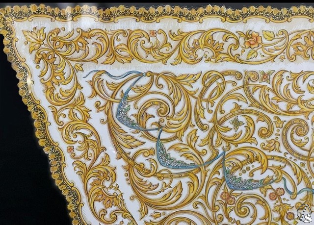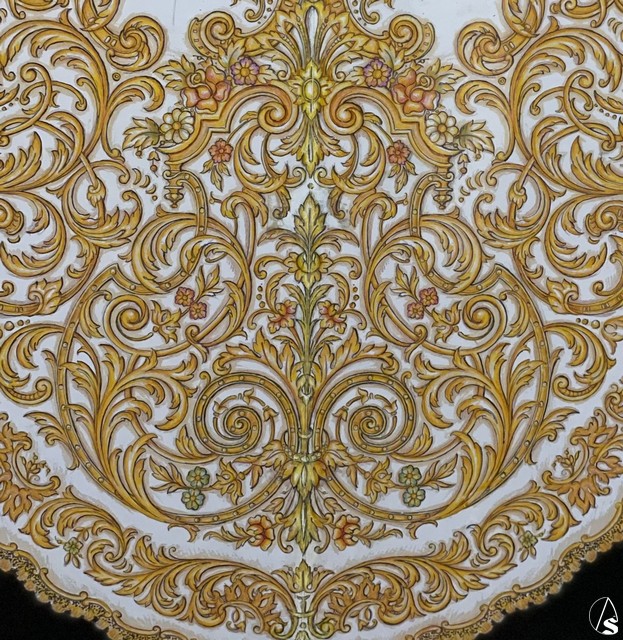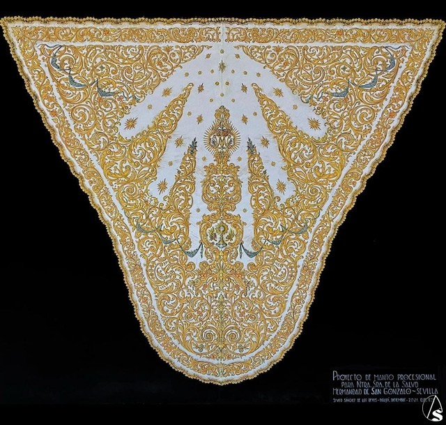Se trataba, primero, de crear una prenda que realzara y completara el paso de palio de la titular con el debido empaque y riqueza, pero que dejara ver el tejido base, sin que la ornamentación coagulase el manto totalmente en oro de una manera recargada. Así es como está estructurado el techo de palio, dejando ver la transparencia de la malla de oro en una amplia proporción de su superficie. Por ello, se escoje el formato de manto “en tiras” o “en abanico”, que estiliza todo el conjunto del paso y proporciona el debido descanso visual.