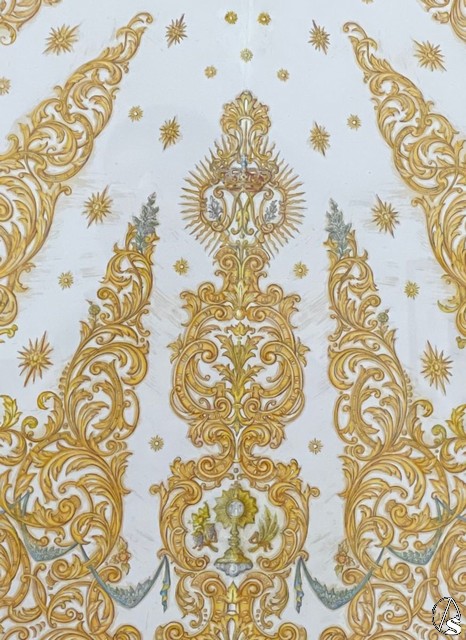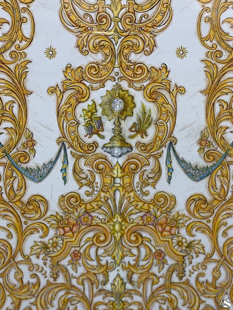 El eje central, que sí es simétrico y tiene mayor envergadura, presenta una cartela central donde se incluye un ostensorio y las especies eucarísticas: la vid y el trigo, alusión directa al carácter sacramental de la hermandad, que constituye una parte esencial de la misma y así está plasmado en su heráldica actual. Más arriba, el monograma de “María” sobre una cartela resplandeciente, flanqueado por una rama de olivo y otra de azucenas, tal y como aparecen en el primer escudo de la hermandad, dibujado en las primitivas reglas de la corporación.