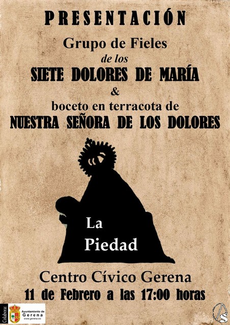 Arte Sacro. El próximo viernes, dia 11 de febrero, tendrá lugar en el Centro Cívico de Gerena la presentación oficial del Grupo de Fieles de los Siete Dolores de María y el boceto en barro de la Virgen de los Dolores, hecho por el imaginero Luis Fernando Ramírez Mata. El evento será a las 17 horas.