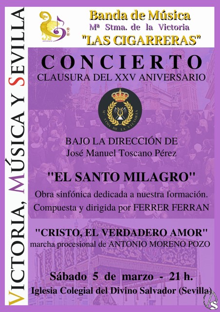 Arte Sacro. La Banda de música María Stma. de la Victoria (las Cigarreras) celebra el día 5 de marzo, a las 21 horas, en la iglesia colegial del Divino Salvador el concierto de clausura del XXV aniversario de esta formación, con la dirección de José Manuel Toscano.