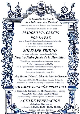 Arte Sacro. La asociación de fieles de Ntro. Padre Jesús de la Humildad que reside en la parroquia de Ntra. Sra. de los Ángeles y Santa Ángela de la Cruz, celebrará el día 4 de marzo piadoso Vía Crucis por la paz que se desarrollará por las calles de la feligresía, sobre las 20:00 horas, al término de la misa de las 19:00 horas.
