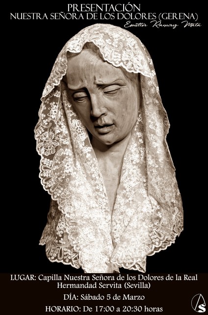 Arte Sacro. El día 5 de marzo tendrá lugar la presentación de Nuestra Señora de los Dolores de Gerena (Sevilla) en la capilla de Nuestra Señora de los Dolores de la Real Ilustre y Venerable Hermandad de Nazarenos y Primitiva Cofradía Servita de Ntra. Señora de los Dolores, Santísimo Cristo de la Providencia, María Santísima de la Soledad y San Marcos Evangelista.