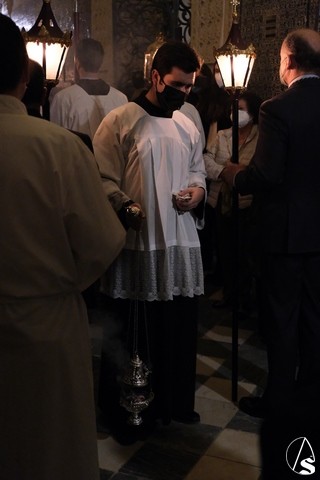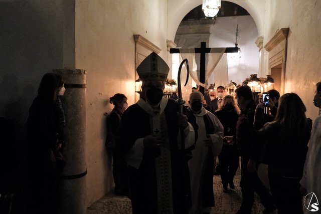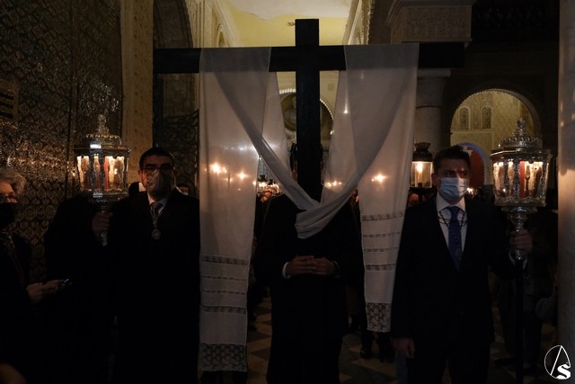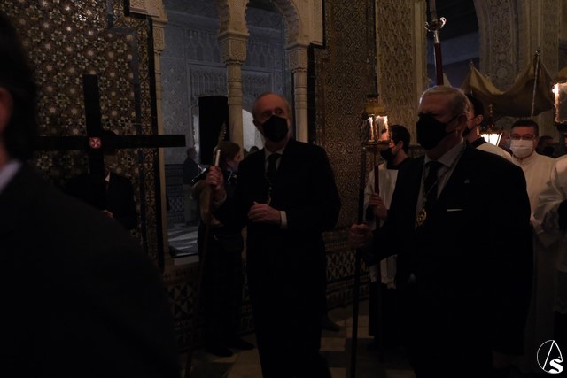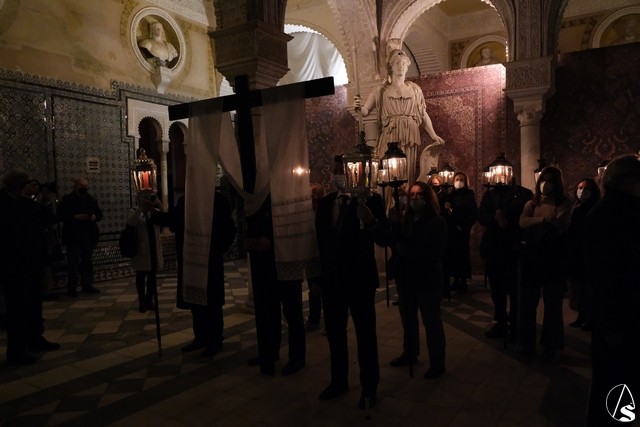 A las 19 horas dio comienzo este acto con la celebración de la solemne eucaristía en el salón de las Caballerizas de la Casa de Pilatos, ante la reliquia del Santo Lignum Crucis. A la finalización de la santa misa dio comienzo el ejercicio del Vía Crucis por las galerías del patio interior y con el siguiente orden procesional: