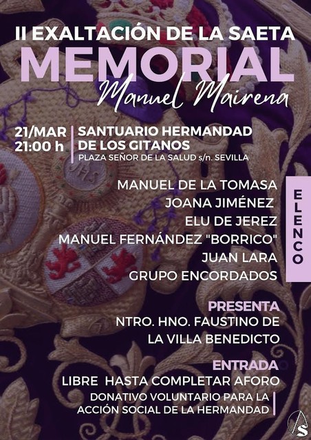 Arte Sacro. La Hermandad Sacramental de Los Gitanos, dentro de su calendario de actividades, actos y cultos programados para esta Cuaresma 2022, el lunes 21 de marzo, celebrará la IIº edición de la Exaltación de la Saeta “Memorial Manuel Mairena”.