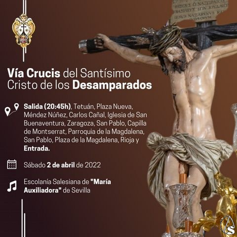 Arte Sacro. El sábado 2 de abril el Santísimo Cristo de los Desamparados saldrá a las calles de Sevilla para el rezo del Vía Crucis. En el recorrido se visitará a las hermandades de San Buenaventura y en Montserrat entrará a la capilla, no podrá hacerlo en la parroquia de La Magdalena ya que está celebrando el Oratorio de la Pasión a esa misma hora.