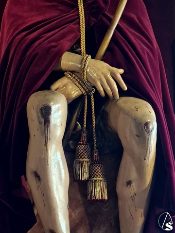 La calle Águilas su casa, el muro de los navarros su vecino, la casa de Pilatos como si de su catedral se tratase, y la puerta Osario aquella que le anuncia el principio y el fin de la llegada o la despedida…andando, en coche, en bicicleta, moto; religiosos o no, la ventana siempre llama la atención por aquel que siempre se encuentra tras ella, el Dios sentado a la espera que alguien le hable, el Cristo que nunca deja de llorar de dolor por aquellos que se marchan o incluso, de emoción, por los que regresan; su báculo de rey una simple caña, y su manto majestuoso una dulce clámide. Descalzo y semidesnudo nos acoge siempre, con la mirada perdida, en el pensamiento, en plena humildad y con máxima paciencia; sus rodillas cansadas hacen eco del dolor como columnas que protegen los borlones que tapan su bendito sudario, y aunque con las manos atadas, su cabeza inclinada, parece saludarnos.