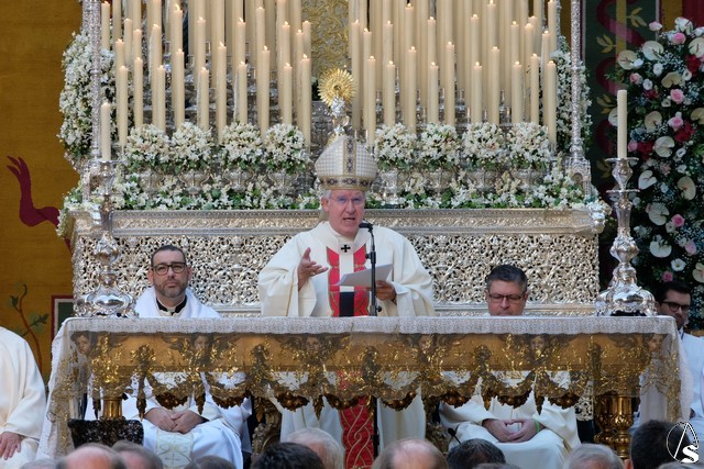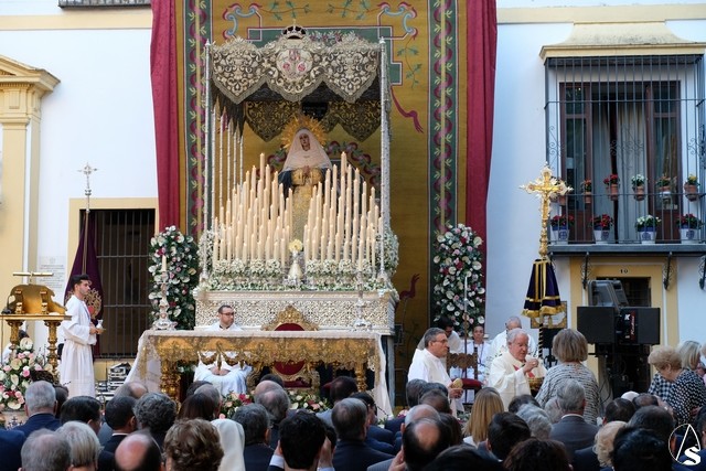 La misa de clausura de la Misión Evangelizadora tuvo lugar en la misma Plaza del Museo, donde la corporación del Lunes Santo había preparado una tarima en el lateral de la capilla que presidía el paso de palio con la Stma. Virgen de las Aguas. Delante del paso estaba el altar y la sede para la celebración eucarística que presidió el arzobispo Saiz Meneses. El resto de la plaza se encontraba acotada en sectores con sillas para los invitados.