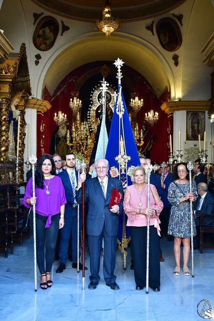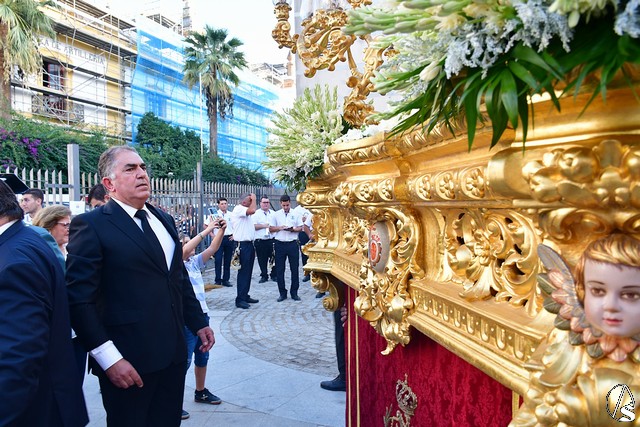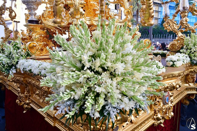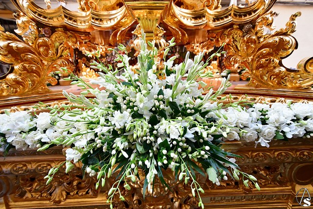 La Virgen de Rosario lució entronizada en la peana que realizara en la población ciudarrealeña de Villarrubia de los Ojos, el tallista José Ángel Banegas y el exorno floral compuesto de nardos, rosas, dendrobium, hipericum y solidago blanco.