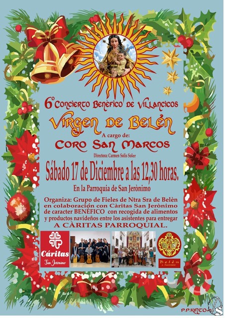 Arte Sacro. El Grupo de Fieles de Nuestra Señora de Belén va a organizar en su sexta edición el concierto de villancicos de carácter benéfico, a cargo del Coro San Marcos de Sevilla, para el sábado 17 de diciembre a las 12,30 horas en la parroquia de San Jerónimo, en el que se interpretarán una serie de villancicos compuestos todos ellos por su directora, Carmen Solís Soler y que finalizará con un popurrí de villancicos populares.