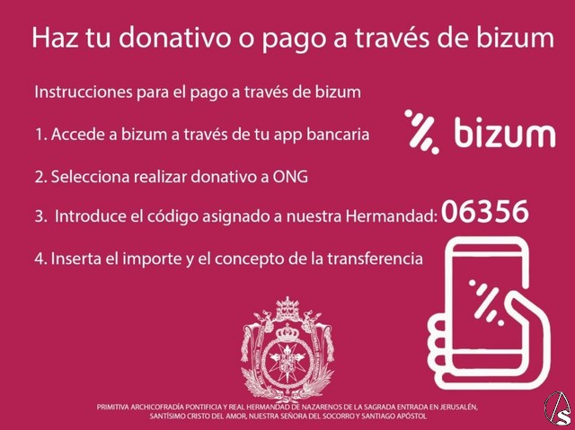 En caso de no poder acudir de forma presencial, puedes remitir tu/s foto/s tamaño carné al correo secretaria@hermandaddelamor.net y efectuar tu donativo a través de la nueva plataforma de pago por bizum (código: 06356).