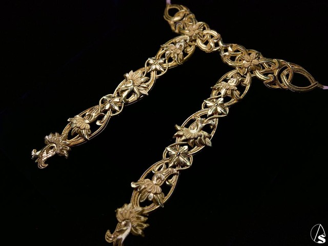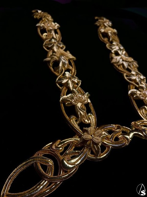 A modo de enredadera, los motivos florales van entrelazando en ella con distintos giros y volúmenes, buscando los contrastes con las técnicas de escamados en lentejuelas y plumas de canutillos, que junto a la hojilla, la cartulina y los torzales en tono mate conforman el conjunto de la pieza. Se completa todo con dos forros independientes, tanto en el terciopelo del propio manto de salida como en tul, característico de su tocado, con la idea de poder ser colocados para dar otra visión de la propia sardineta.