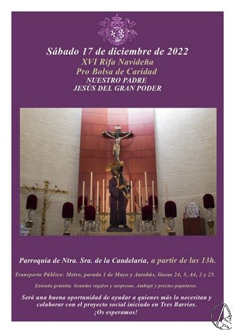Arte Sacro. El sábado 17 de diciembre se celebrará la 16ª edición de la Rifa de Navidad que organiza la Hermandad Gran Poder a beneficio de la bolsa de caridad y en esta ocasión ha decidido que el lugar de encuentro sea en la parroquia de Nuestra Señora de la Candelaria a partir de las 13:00 horas.