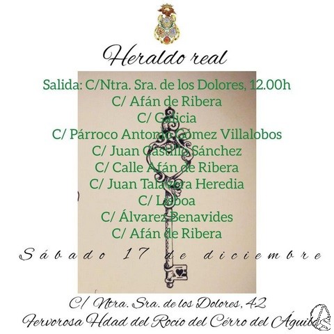 Arte Sacro. Hoy sábado 17 de diciembre a las 12 horas tendrá lugar la salida del Heraldo Real de la Hermandad del Rocío de Sevilla Cerro del Águila que recorrerá las calles: Ntra. Sra. de los Dolores, Afán de Ribera, Galicia, Párroco Antonio Gómez Villalobos, Juan Castillo Sánchez, Afán de Ribera, Juan Talavera Heredia, Lisboa, Álvarez Benavides, Afán de Ribera y Ntra. Sra. de los Dolores en torno a las 14,30 horas.