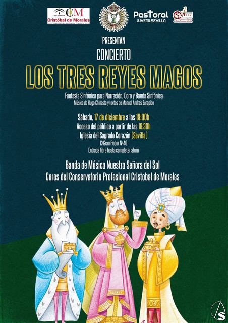 A las 19 horas, la Banda de música Nuestra Señora del Sol participará en el concierto “Los Tres Reyes Magos” en la Iglesia del Sagrado Corazón (C/ Jesús del Gran Poder nº 40). Se trata de una fantasía sinfónica para narración, coro y banda sinfónica con música de Hugo Chinesta y textos de Manuel Andrés Zarapico, en la que también participarán los Coros del Conservatorio Profesional Cristóbal de Morales. La entrada será libre hasta completar aforo.