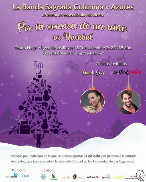 Por otro lado, el mismo sábado a las 18.30 horas tendrá lugar en el Teatro Hogar Virgen de los Reyes un espectáculo navideño ofrecido por la Banda de CC. TT. Sagrada Columna y Azotes. Bajo el título “Por la sonrisa de un niño en Navidad”, contará con la participación de los artistas Ana de Caro y ‘Señor Gañán’. La presentación del acto correrá a cargo del periodista Manuel Lamprea. La entrada será por invitación y se deberá aportar 1 litro de leche por persona a la entrada del teatro, que irá destinado a la Bolsa de Caridad de la Hermandad de Las Cigarreras.