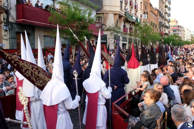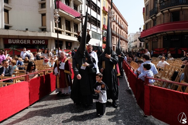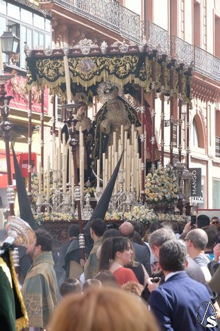 A las 20,34 horas pidió la venia la hermandad de la Soledad de San Lorenzo, lo que significaba tres minutos de retraso en el total del día. Tras el largo cortejo de nazarenos, con muchos niños en los primeros tramos, venía el paso de la Stma. Virgen exornado por iris blancos. Se le cantaron dos saetas, una en la peña Bética y la otra en la Confitería la Campana. A las 21,13 horas el paso se introdujo en la calle Sierpes terminando, de esta manera, este Sábado Santo. Acaba aquí la Semana Santa de abono, aunque las sillas estarán puestas para que todo aquel que quiera, pueda presenciar desde este punto el discurrir de la hermandad de la Resurrección.