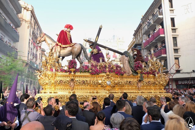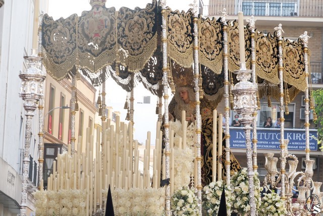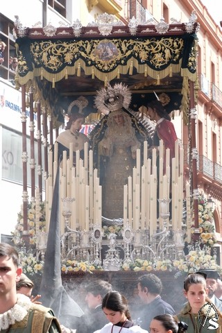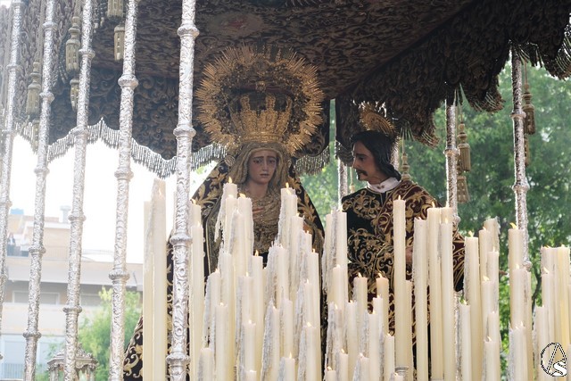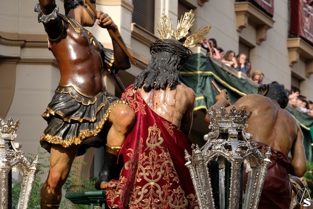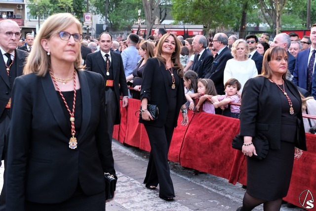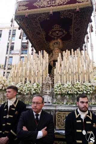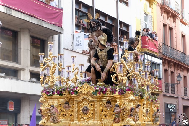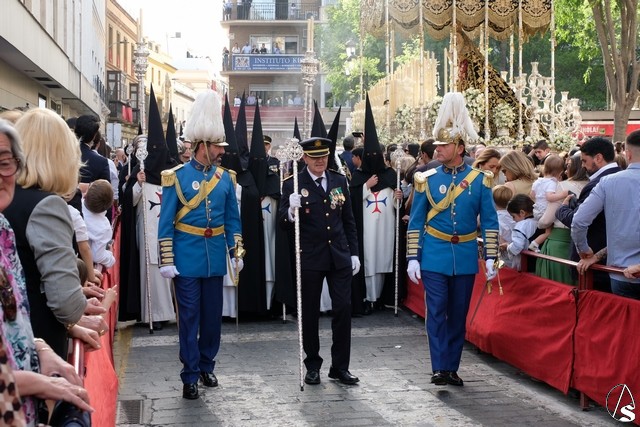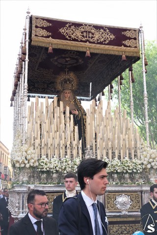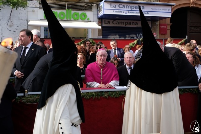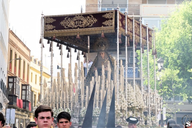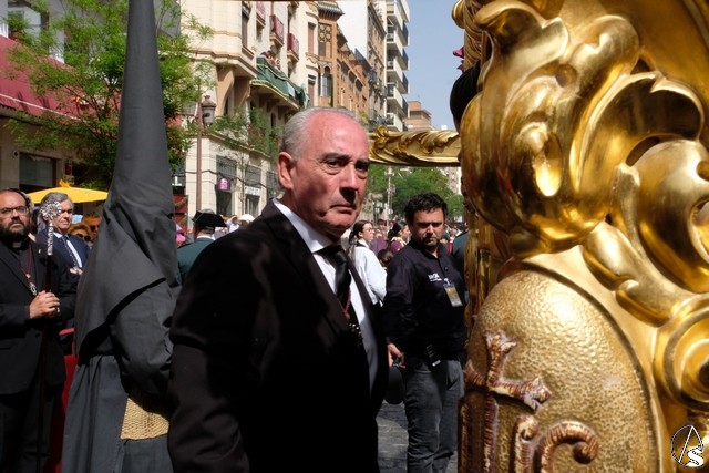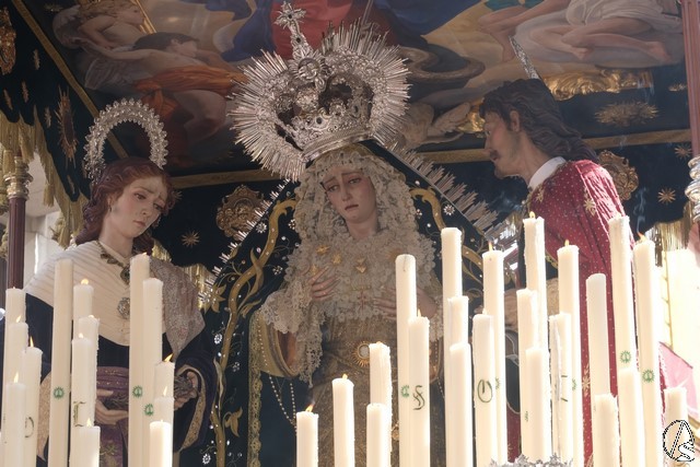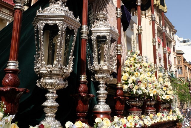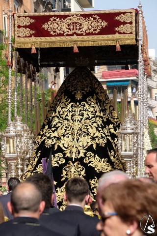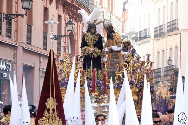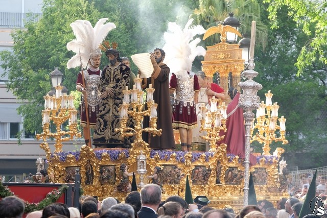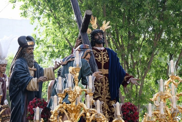 El misterio de la Sentencia de Cristo continuó la procesión. El Señor de la Macarena llevó la túnica de Rodríguez Ojeda conocida como la de los cardos y potencias de Seco Velasco, recientemente restauradas. Lirios morados como exorno floral.