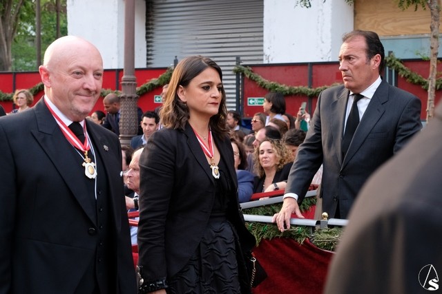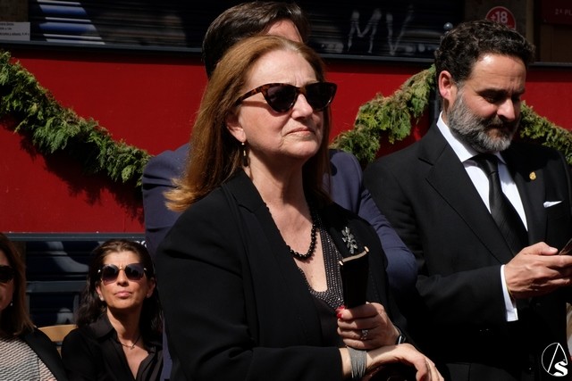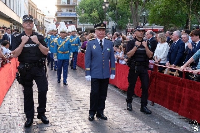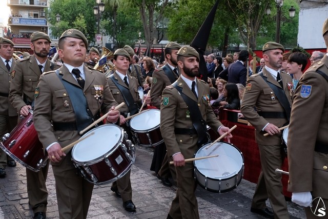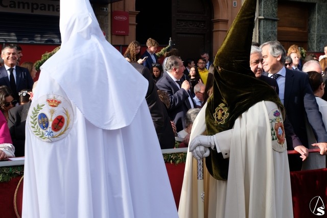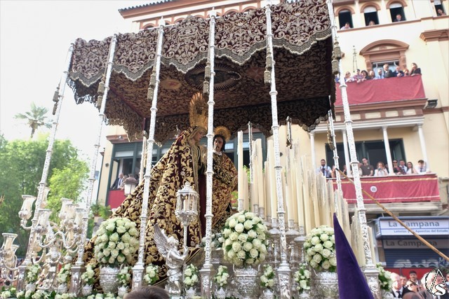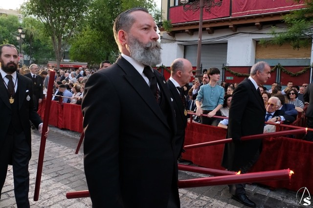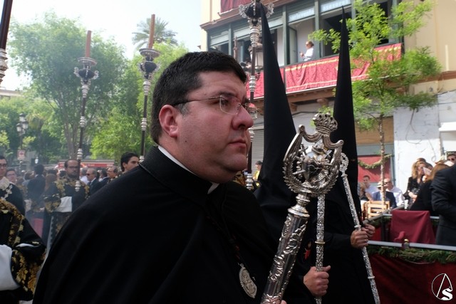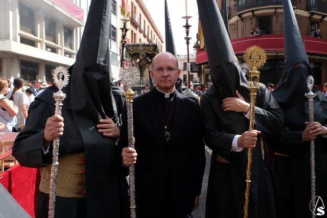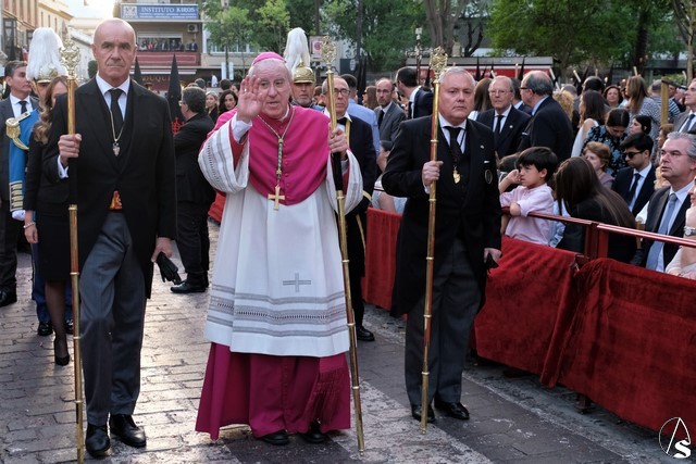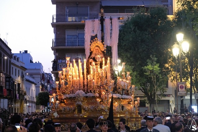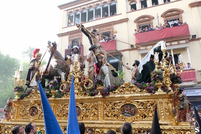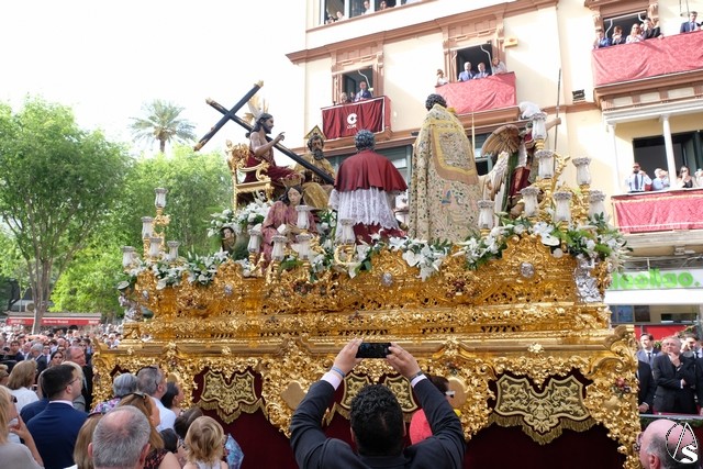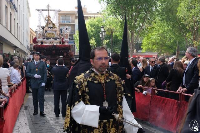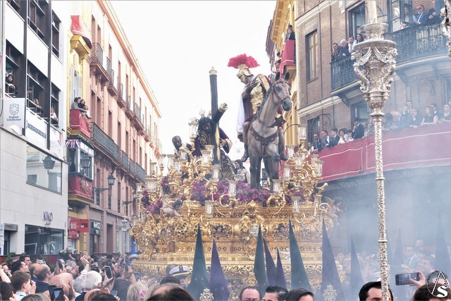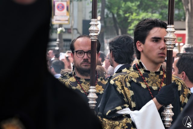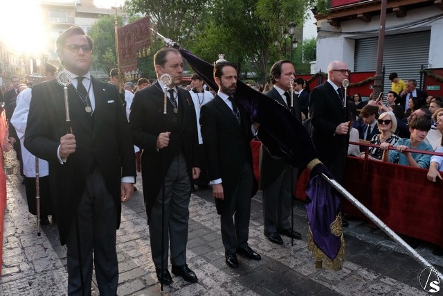 El misterio de la Sentencia de Cristo continuó la procesión. El Señor de la Macarena llevó la túnica de Rodríguez Ojeda conocida como la de los cardos y potencias de Seco Velasco, recientemente restauradas. Lirios morados como exorno floral.
