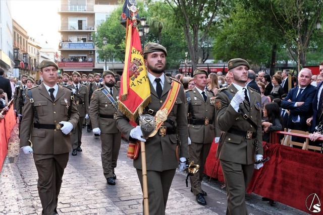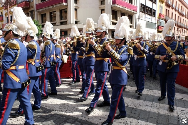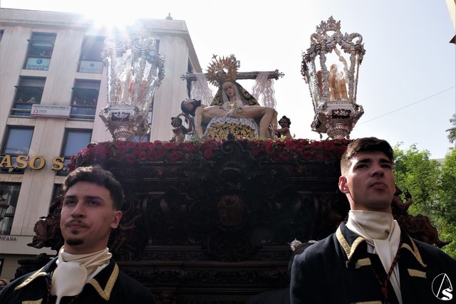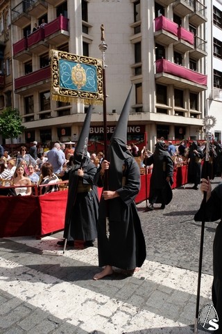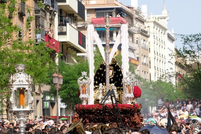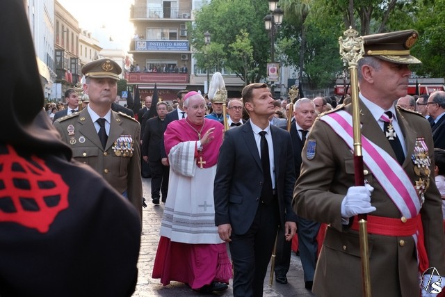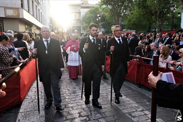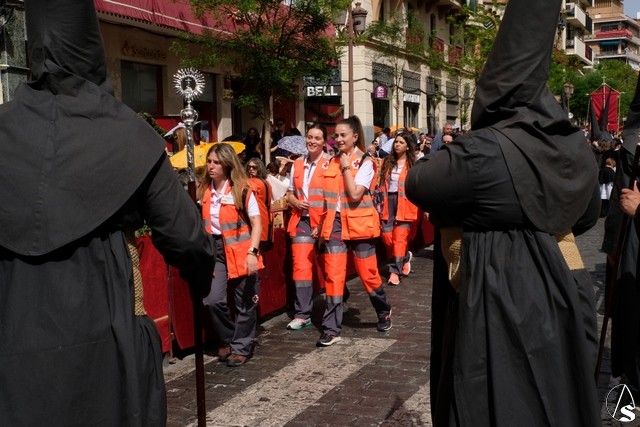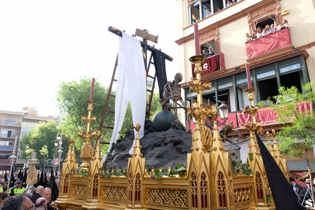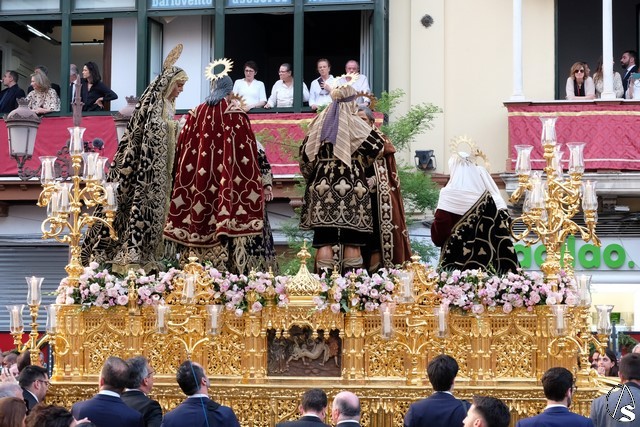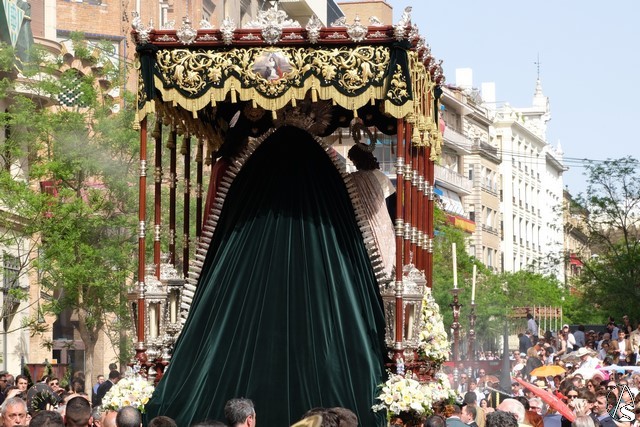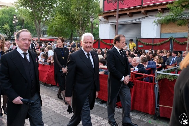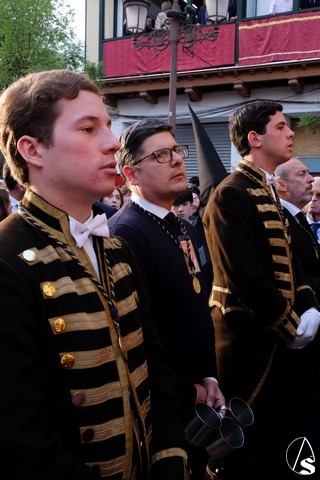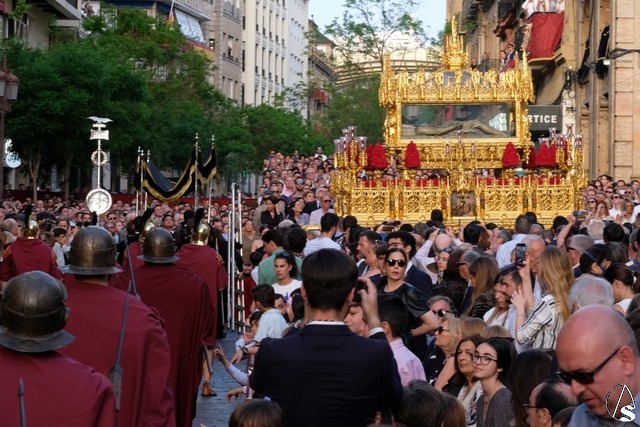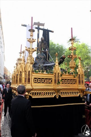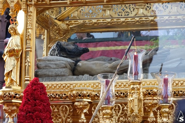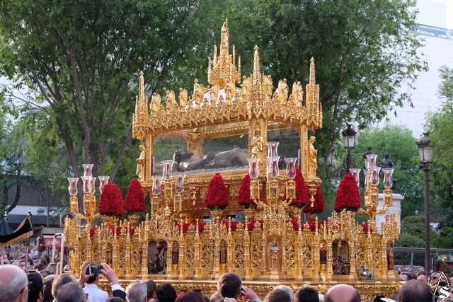 Tras los pasos se recuperó el discurrir habitual de la hermandad del Santo Entierro. El paso del Cristo Yacente pasó a los sones de la marcha “Amarguras” tocada por la banda sinfónica municipal de Sevilla. Iba exornado por claveles rojos y pasó con un buen andar por la Campana. Delante del paso de la urna figuraba una coral polifónica. El paso de la Virgen de Villaviciosa llevó flores variadas predominando el color blanco. Los bordados de las imágenes del Duelo son obras magníficas de estilo gótico. La banda militar del ejército de tierra, que acompaña al paso a gran distancia del mismo, tocó una marcha. Fue muy aplaudido el discurrir de la compañía del ejército que desfiló tras el paso del Duelo. Se dejó tres minutos de retraso, que en el total de la jornada, hasta ese momento indicaban que había dos minutos.