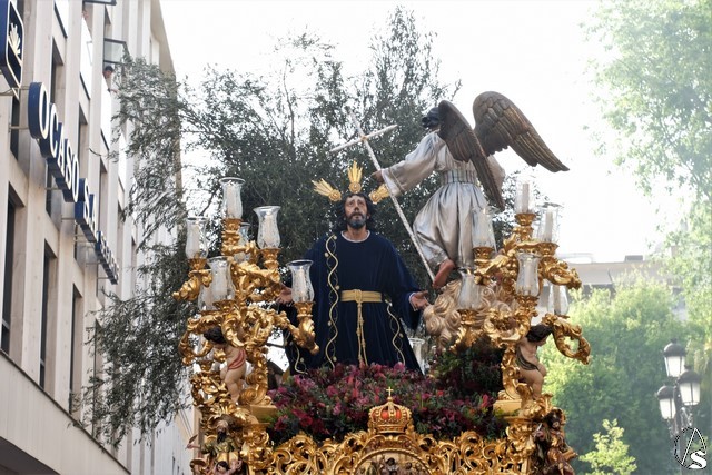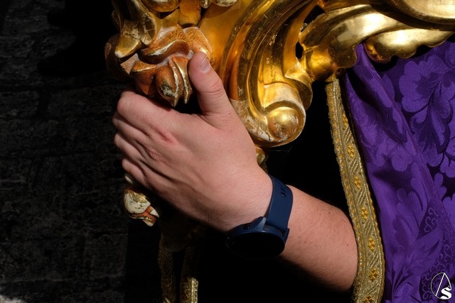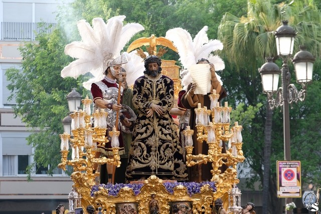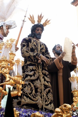 El Señor del Soberano Poder ante Caifás continúo el cortejo, con la túnica bordada morada y un exorno de flores moradas.