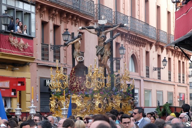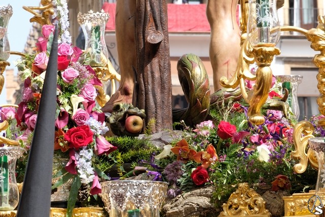 El penúltimo paso fue el del Cristo del Calvario que llevó como exorno floral claveles rojos en las jarras y lirios morados en el monte y mesa.