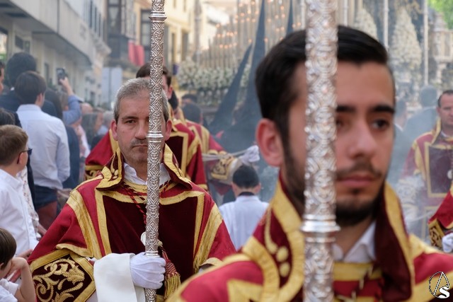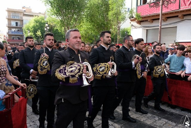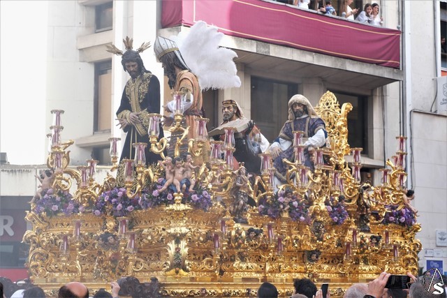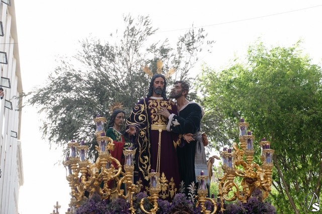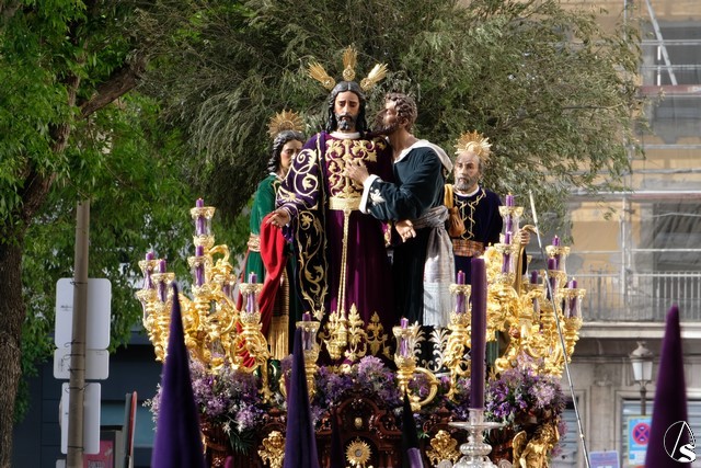 El misterio de Ntro. P. Jesús de la Redención fue el siguiente en pasar. El Señor llevó túnica morada bordada. Algunos apóstoles también cambiaron sus vestimentas sobre las llevadas el pasado Lunes Santo. Flores moradas como exorno floral.