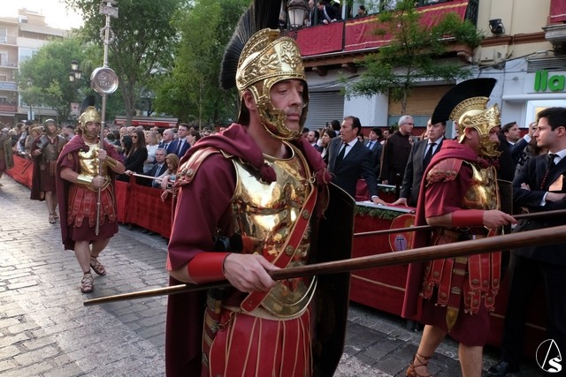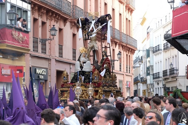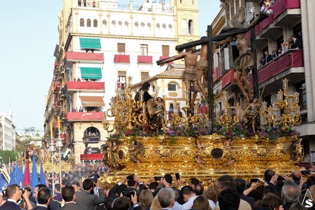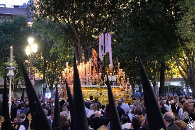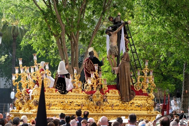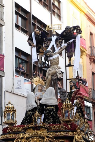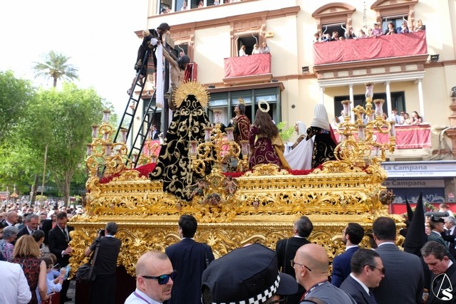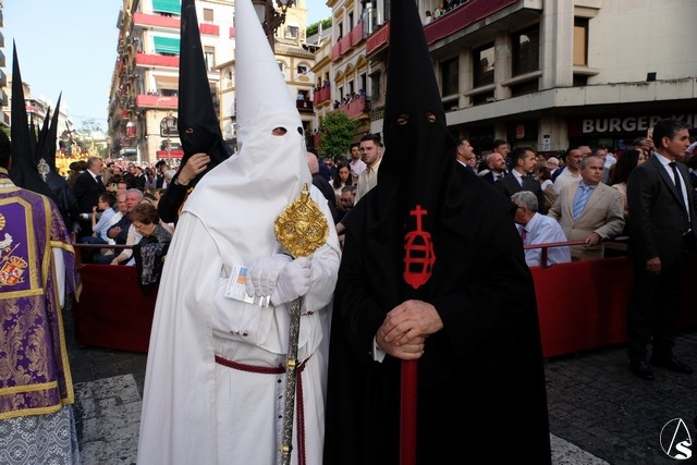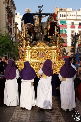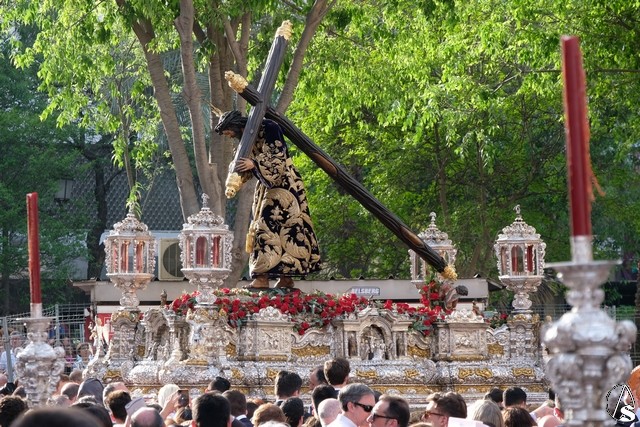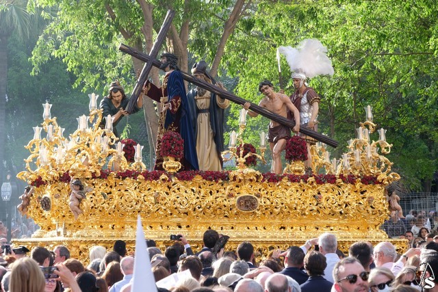 El Señor de las Tres Caídas de Triana fue el siguiente en pasar. Muchas novedades en el paso con respecto a lo ofrecido la pasada Madrugada. El Señor lució la túnica bordada de Jesús Rosado. El Cirineo estrenó túnica bordada y el resto de imágenes, igualmente, estrenaron sus ropajes, realizados por una hermana. El romano procesionó como lo hizo en el Santo Entierro grande de 1948, con un casco de plumas rojas a modo de cepillo. El exorno floral estuvo compuesto por flores de color morado.