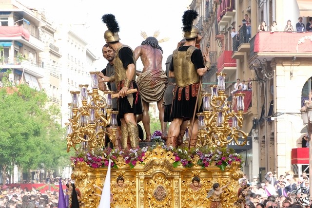 El paso del Señor atado a la Columna de las Cigarreras fue el siguiente en pasar. El paso llevó rosas moradas y flores silvestres.