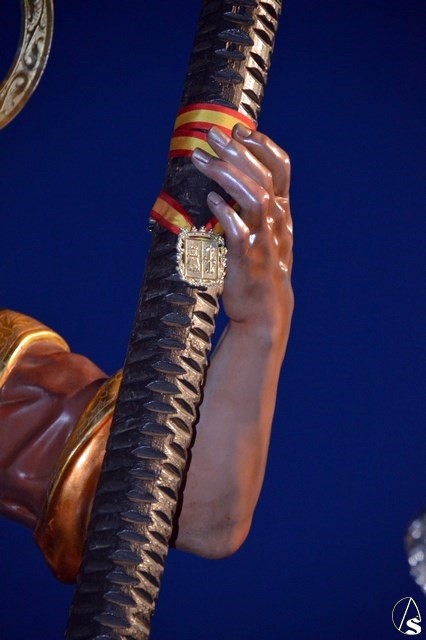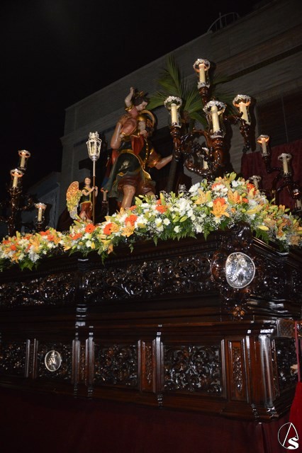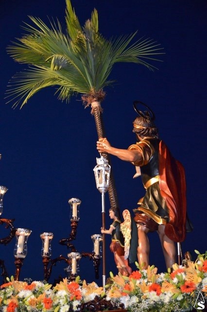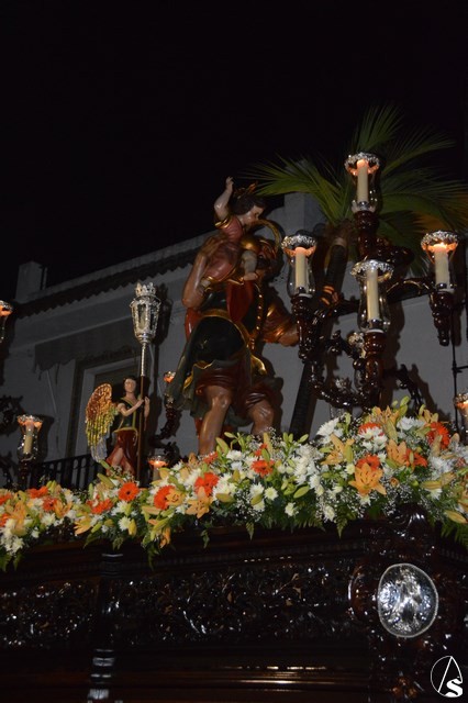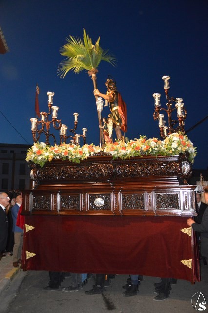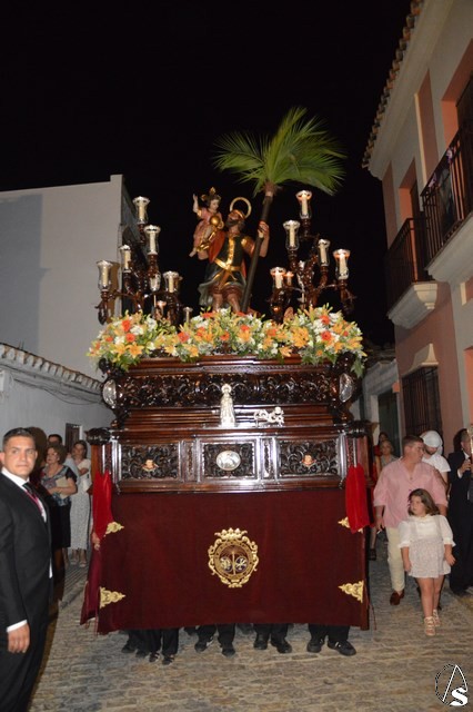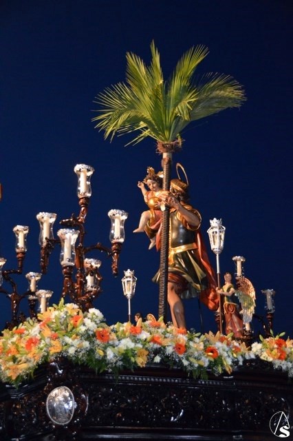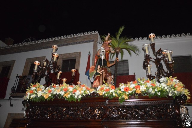 El Santo Patrón de Burguillos procesiona sobre paso de madera tallada de tonos oscuros, restaurado recientemente. Lo alumbran cuatro candelabros de guardabrisas en las esquinas y dos faroles de plata portados por dos ángeles a ambos lados de la imagen. En la delantera del paso porta una imagen en plata de la Santísima Virgen del Valle, titular mariana de esta Hermandad.