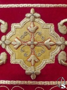 Los bordados han sido colocados sobre un terciopelo de color guinda, una tela donada por una familia muy vinculada en la Virgen de los Reyes, así como el encaje, obra de Casa Rodríguez.