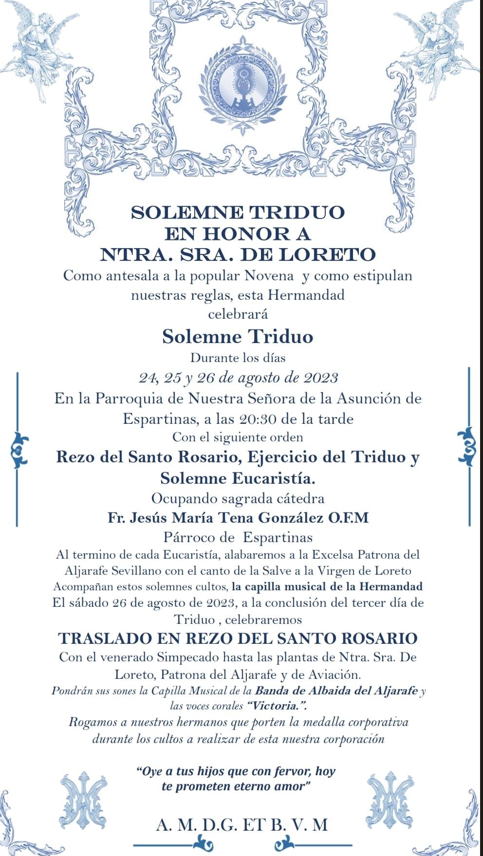 A la conclusión del tercer día de Triduo, está Hermandad procederá a celebrar el Solemne Traslado en Rezo del Santo Rosario con el venerado Simpecado hasta el Santuario de Loreto, poniendo la clave musical, los sones de la capilla musical de la Banda de Música de Albaida del Aljarafe y las voces del grupo “Victoria”.