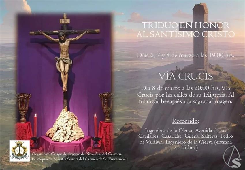 Arte Sacro. Los días 6, 7 y 8 de marzo a las 19 horas, la parroquia de Nuestra Señora del Carmen de Su Eminencia, junto con el Grupo de Devotos de la Virgen, tendrán el triduo en honor al Santísimo Cristo Crucificado.