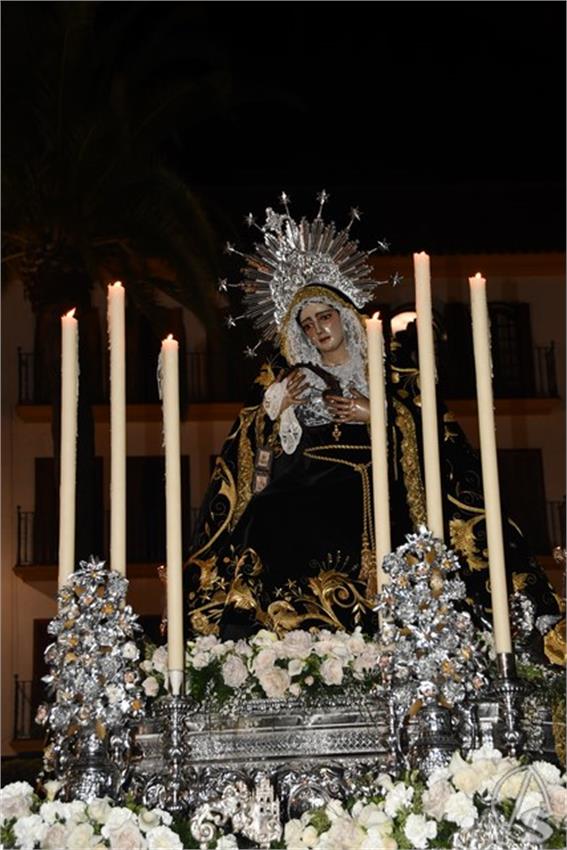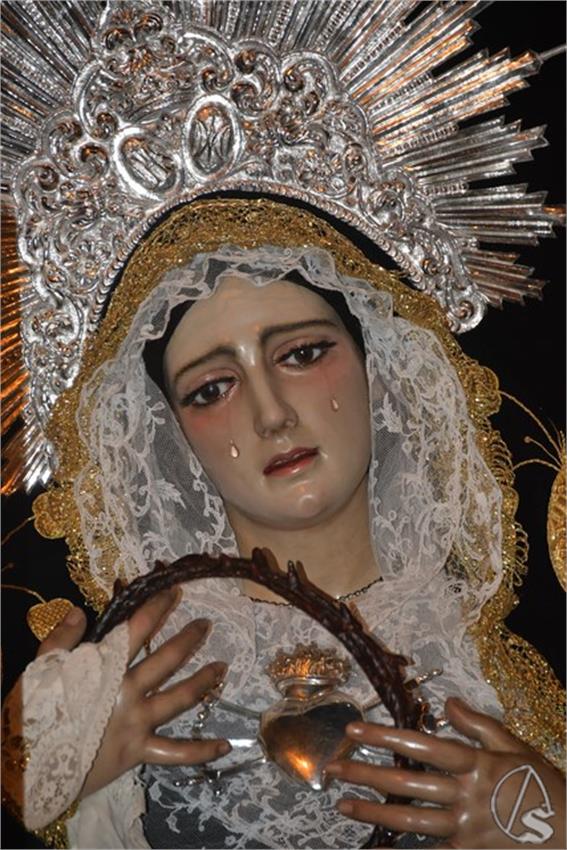 Para esta magna ocasión procesionó en andas sobre peana de plata e iluminada con varias piezas de candeleros en la delantera y candelabros de guardabrisas de plata en la trasera. La Santísima Virgen de los Dolores lució saya y manto negro bordado en oro estrenando el tocado de encaje de punto de aguja de Bruselas del S.XIX. En sus manos portó corona de espinas y un escapulario servita bordado en seda blanca y morada, con grabados que representa el corazón con los siete puñales, y la Virgen a los pies de la Cruz, además de un rosario de plata y azabache. Sobre su pecho Cruz de oro, brillantes y rubí.
