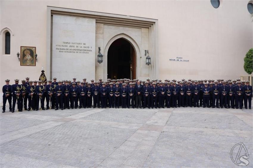 Tras un breve e íntimo acto en el interior del Santuario de Los Gitanos, los hermanos músicos rezaron a sus Titulares, el Señor de la Salud y María Santísima de las Angustias, en los minutos previos a poner sus sones al Señor de la Caridad de la Hermandad de San José Obrero, donde estrenaron estos uniformes.