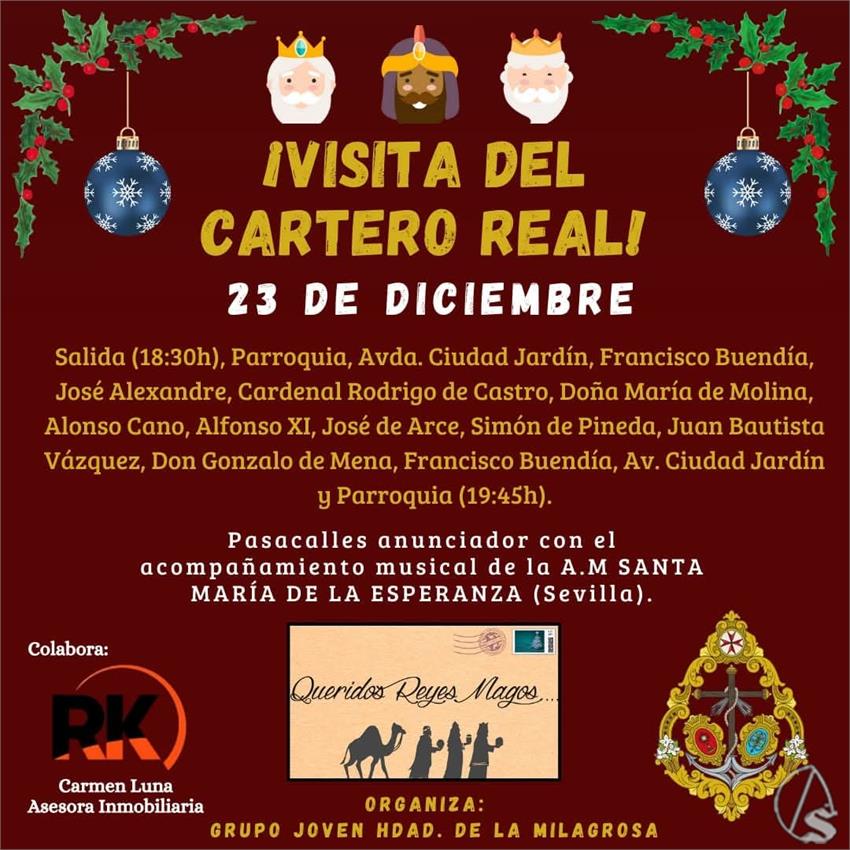 Arte Sacro. El Cartero Real de S.S.M.M los Reyes Magos visitará la hermandad de la Milagrosa el lunes 23 de diciembre, para recoger las cartas de los niños y niñas del barrio de Ciudad Jardín, a partir de las 18,30 horas.