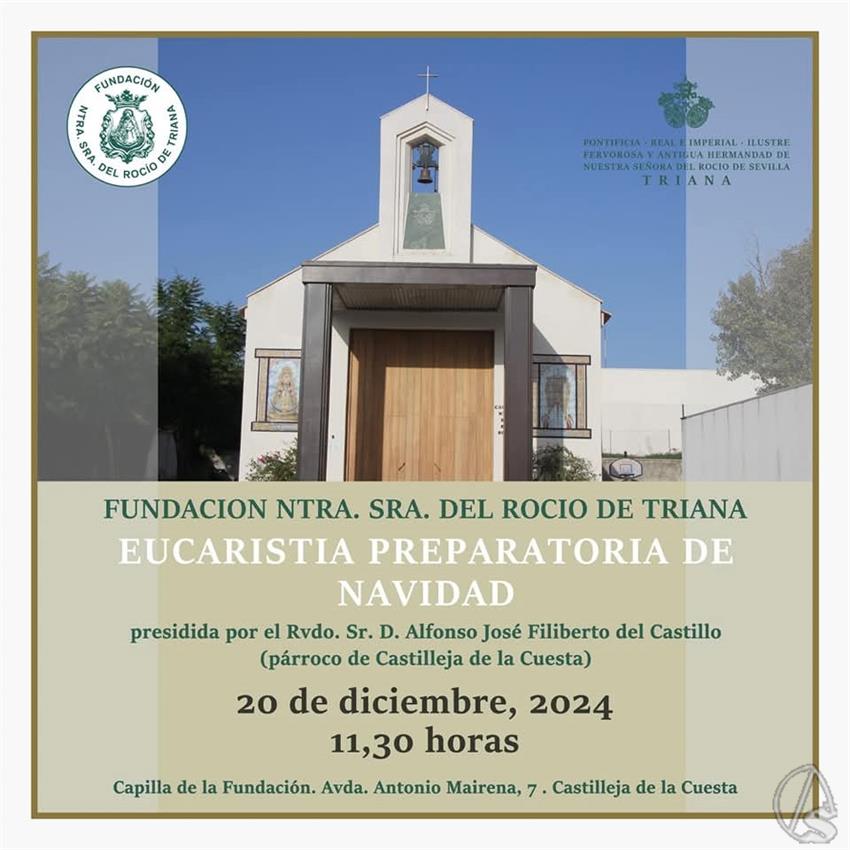 Arte Sacro. El viernes día 20 de diciembre a las 11,30 horas, la hermandad del Rocío de Triana celebrará, (D.m.), una eucaristía preparatoria para la Navidad en la Fundación, sita en la avenida Antonio Mairena nº 7 de Castilleja de la Cuesta, presidida por Alfonso José Filiberto del Castillo, párroco de la Parroquia de Santiago y Purísima Concepción.