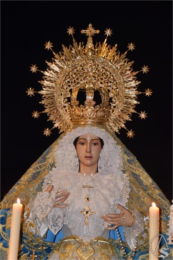 En distintos puntos del recorrido se rezó el Santo Rosario con unos misterios cantados por el coro de la Hermandad mientras que a lo largo del recorrido estuvo acompañada por la Banda de Música de Santa Ana de Dos Hermanas. Especialmente bello fue su transitar por la calle 4 de diciembre, dónde los vecinos le regalaron una bella petalá que se posaron sobre sus andas. También la calle Matas se engalanó para la ocasión con flores de papel y arco colgando anclas en su parte central, así como con pancartas con su nombre e imágenes que colgaban de fachadas de la calle.