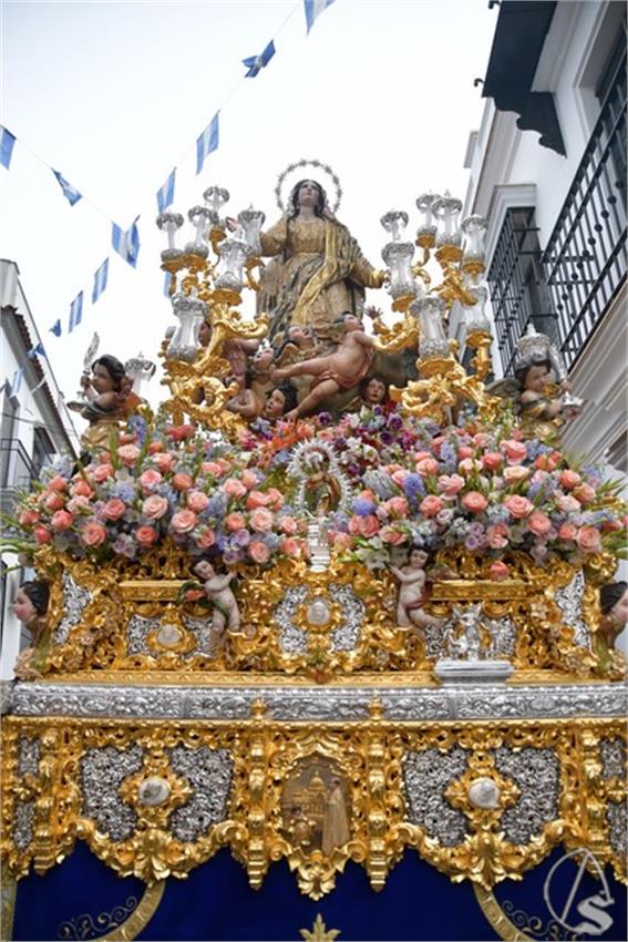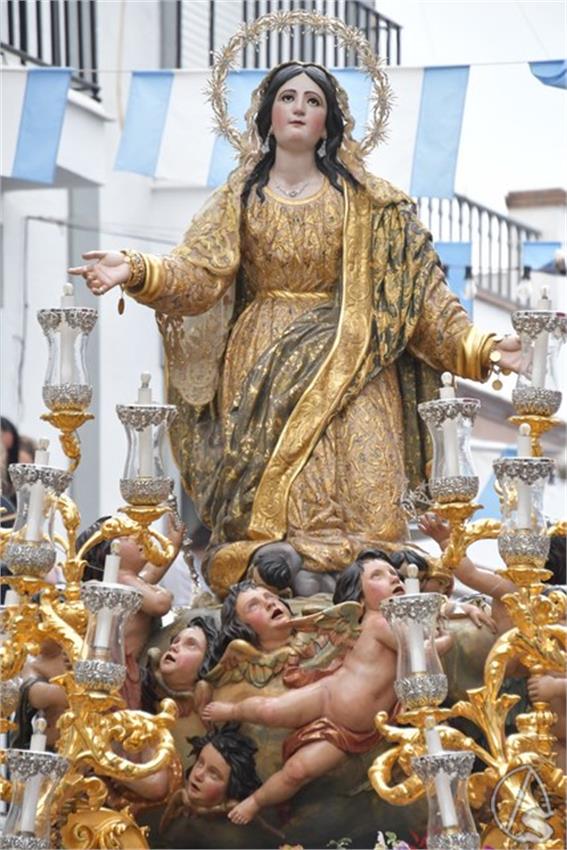 La Santísima Virgen en su Gloriosa Asunción procesiona en un magnífico paso que combina el dorado y la plata. Simula un extraordinario sepulcro desde el que se eleva a los cielos la Santísima Virgen entre una corte de angelitos que portan distintos elementos marianos. Iluminan a la Virgen seis candelabros de guardabrisas de madera tallada y dorada.