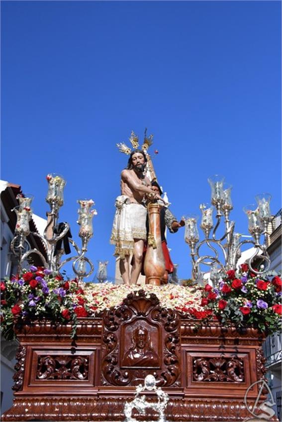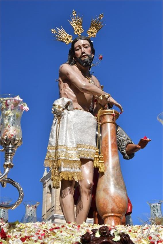 El Santísimo Cristo de las Misericordias es una bella talla de autor desconocido, aunque se piensa que puede ser obra del escultor antequerano Diego Márquez de Vegas fechado en la segunda mitad del siglo XVIII. El Señor se nos presenta atado a la columna recibiendo los golpes del sayón que encontramos tras Él. Este sayón es de autor desconocido de finales del siglo XVII o principios del siglo XVIII. Para esta salida extraordinaria el Señor de las Misericordias portó potencias de metal dorada y sudario de tonos claros.