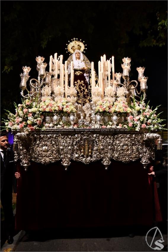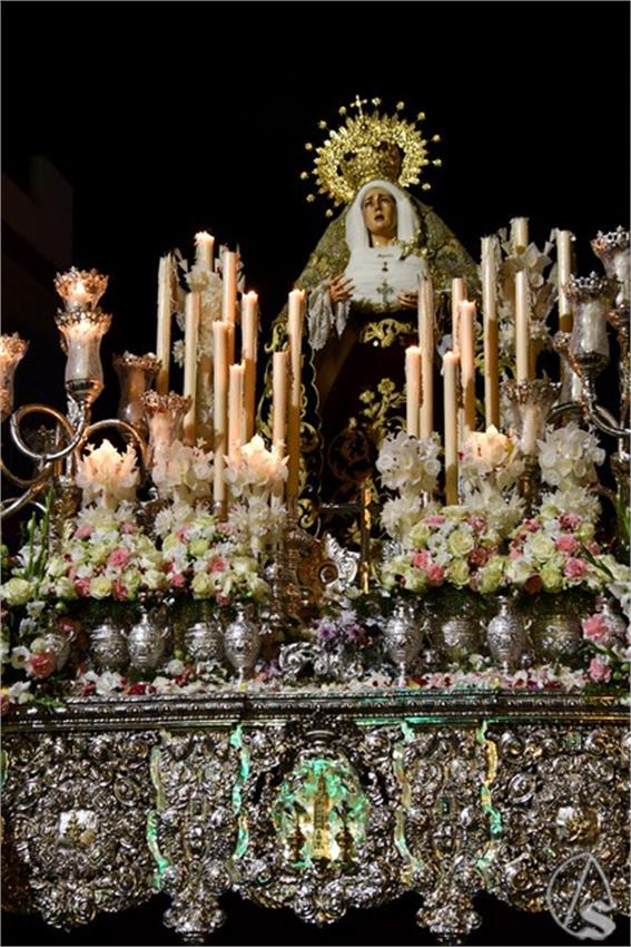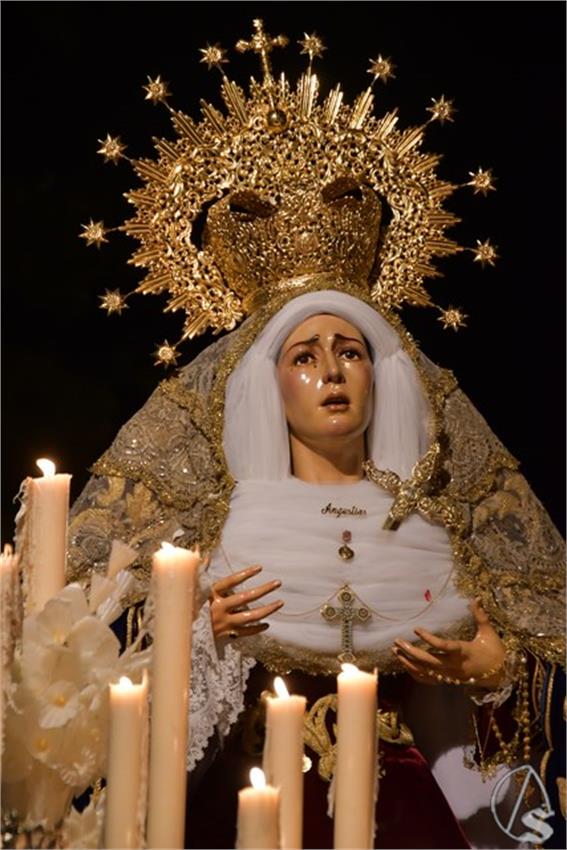 Nuestra Señora de las Angustias, obra de Augusto Morilla Delgado del año 1987, procesionó en su paso con distintos enseres que embellecieron este histórico regreso. Para esta magna ocasión la Virgen de las Angustias lució su saya granate bordada y manto azul bordado, cedido por la Hermandad de Jesús de la ciudad panadera. Sobre sus sienes la corona de plata sobredorada que sus hijos le regalaron hace unos años. En su pecho lució puñal y broche con su nombre, así como una hermosa cruz pectoral. En su mano derecha sostuvo un pañuelo, mientras que en la izquierda portó el rosario.