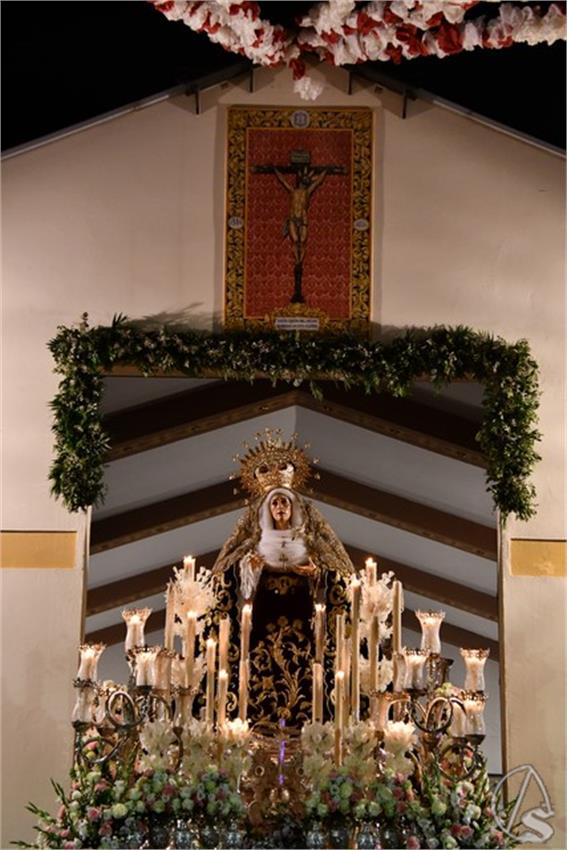 Ya había caído la noche cuando atravesó la calle La Plata buscando la Plaza del Paraíso donde abandonaba el centro de la localidad y buscaba las calles de su barrio subiendo Telmo Maqueda y Barrio Obrero que cada año la esperan en la tarde del Martes Santo. Sobre las ocho de la tarde llegaba a la Calle Cristóbal Colón que la esperaba engalanada y donde volvió a caer pétalos sobre su paso mientras los vítores y vivas volvían a escucharse. El frío se hacía presente al cruzar la calle Marchena y Lebrija cuando su barrio la esperaba para arroparla en esta noche. La calle Los Palacios se engalanó de nuevo para su Virgen que podía sentir el cariño de sus vecinos.