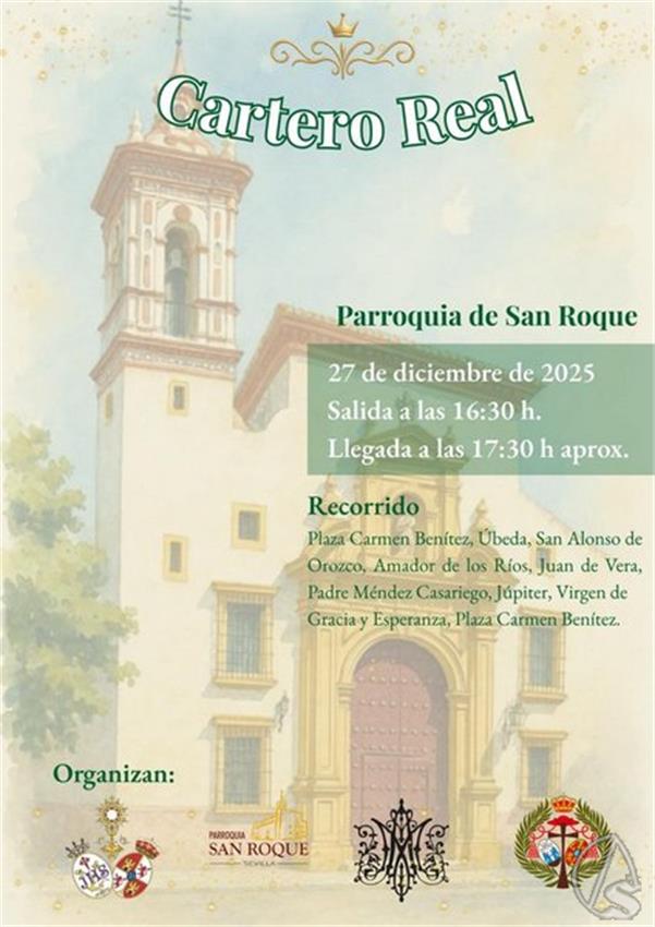 Arte Sacro. El sábado 27 de diciembre, a partir de las 16:30 horas, partirá el Heraldo Real desde la parroquia de San Roque con el siguiente itinerario: Plaza Carmen Benítez, Úbeda, San Alonso de Orozco, Amador de los Ríos, Juan de Vera, Padre Méndez Casariego, Júpiter, Virgen de Gracia Esperanza, Plaza de Carmen Benítez, llegando a las 17:30 horas.