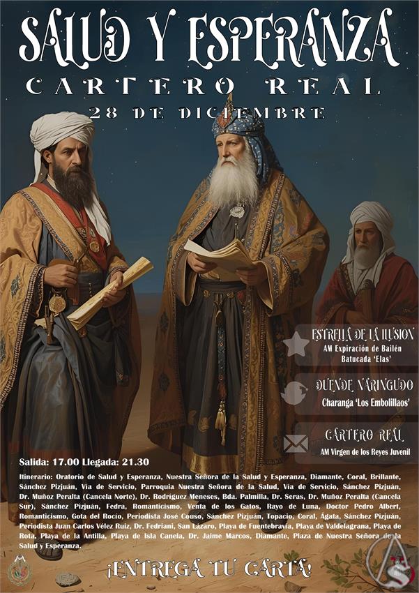 Arte Sacro. El próximo día 28 de diciembre, fiesta de los Santo Inocentes, el Sr. Cartero Real de SS.MM. los Reyes Magos de Oriente visitará Salud y Esperanza, recorriendo las barriadas para que todos los niños que quieran entregar su carta a los Reyes Magos, puedan hacerlo.