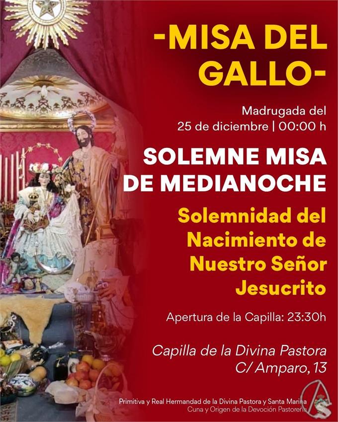 Arte Sacro. La hermandad de la Divina Pastora y Santa Marina celebrará, como ya es tradicional, el próximo día 25 de diciembre, a las 00,00 horas, la solemne misa de Medianoche, en la solemnidad del Nacimiento de Nuestro Señor Jesucristo; "La Misa del Gallo".