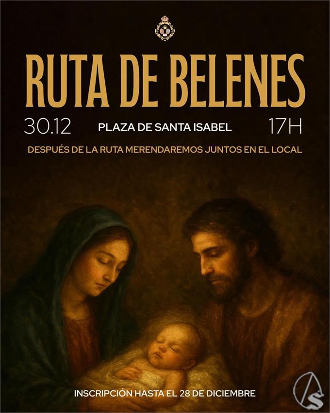 Arte Sacro. El próximo día 30 de diciembre, entre las 17 y las 19 horas, tendrá lugar una "ruta belenística" con los más pequeños de la hermandad (entre 6 y 12 años) y aquellos padres que deseen acompañarlos. El punto de encuentro para la salida será la Plaza de Santa Isabel y finalizaran con una merienda en la casa de hermandad.