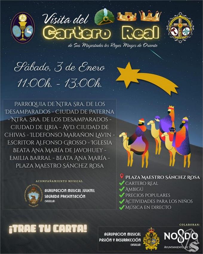 Arte Sacro. El sábado 3 de enero el Cartero Real de SSMM los Reyes Magos de Oriente visitará el barrio de Alcosa, a quien los más pequeños podrán entregar sus cartas.