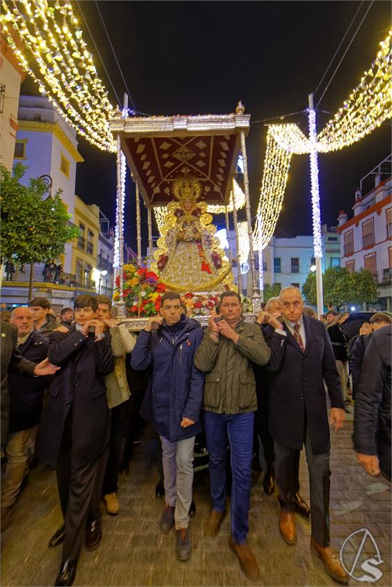 Precioso paseo por el centro de Sevilla, en unas andas similares a la de la patrona de Almonte. La talla, replica de la Reina de las Marismas, es de autor anónimo y fue restaurada por el imaginero Sebastián Santos en 1952.