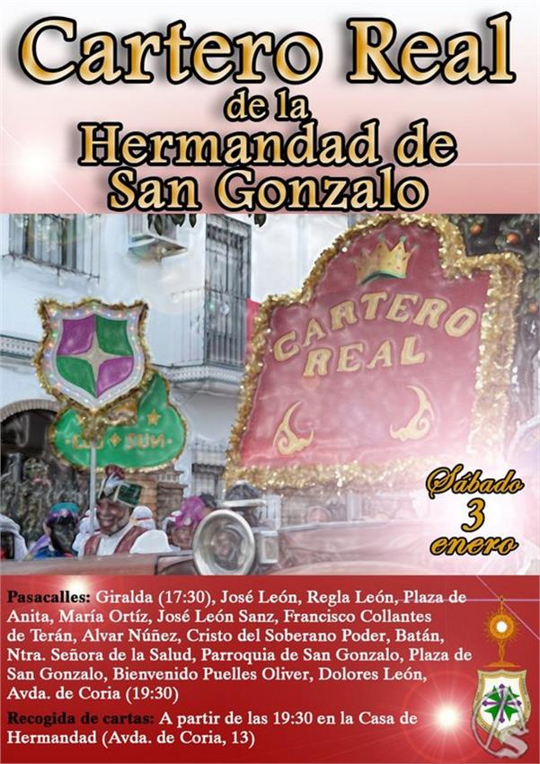 Arte Sacro. El Cartero Real visitará San Gonzalo en la cita organizada por la juventud de la Hermandad, el sábado 3 de enero de 2026, comenzando con el pasacalle que comenzará a las17:30 horas con recorrido: Giralda, José León, Regla León, Plaza de Anita, María Ortiz, José León Sanz, Francisco Collantes de Terán, Alvar Núñez, Cristo del Soberano Poder, Batán, Ntra. Señora de la Salud, Parroquia de San Gonzalo, Plaza de San Gonzalo, Bienvenido Puelles Oliver, Dolores León, Avenida de Coria a las 19:30 horas, donde recogerá las cartas.
