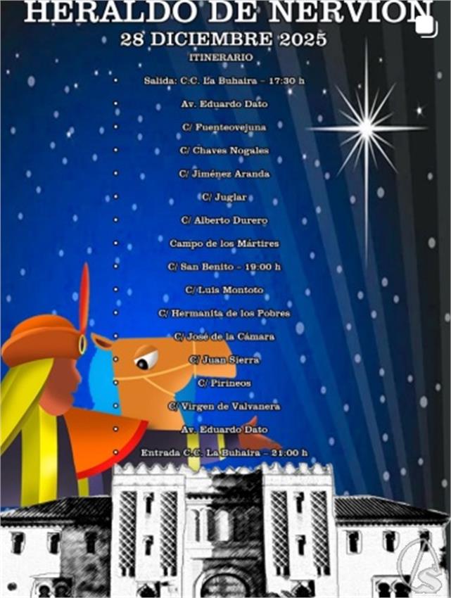 Arte Sacro. Esta tarde el Heraldo Real recorrerá las calles del barrio de Nervión acompañado de música y emoción, anunciando que la magia ya está muy cerca. El recorrido será: salida del C.C. La Buhaira a las 17:30 horas, Av. Eduardo Dato, Fuenteovejuna, Chaves Nogales, Jiménez Aranda, Juglar, Alberto Durero, Campo de los Mártires, San Benito (19:00 horas), Luis Montoto, Hermanita de los Pobres, José de la Cámara, Juan Sierra, Pirineos, Virgen de Valvanera, Av. Eduardo Dato y entrada en C.C. La Buhaira a las 21:00 horas.